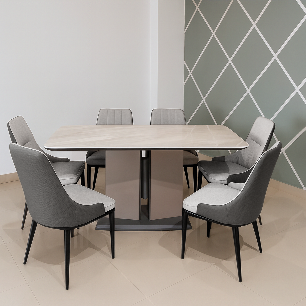 Elevate your dining space with this stunning 6-seater modern dining table, featuring a luxurious marble top paired with sleek and elegant design. Perfectly combining functionality with style, this dining table is a centerpiece that will impress family and guests alike. Its unique blend of beauty and practicality makes every meal a special occasion.